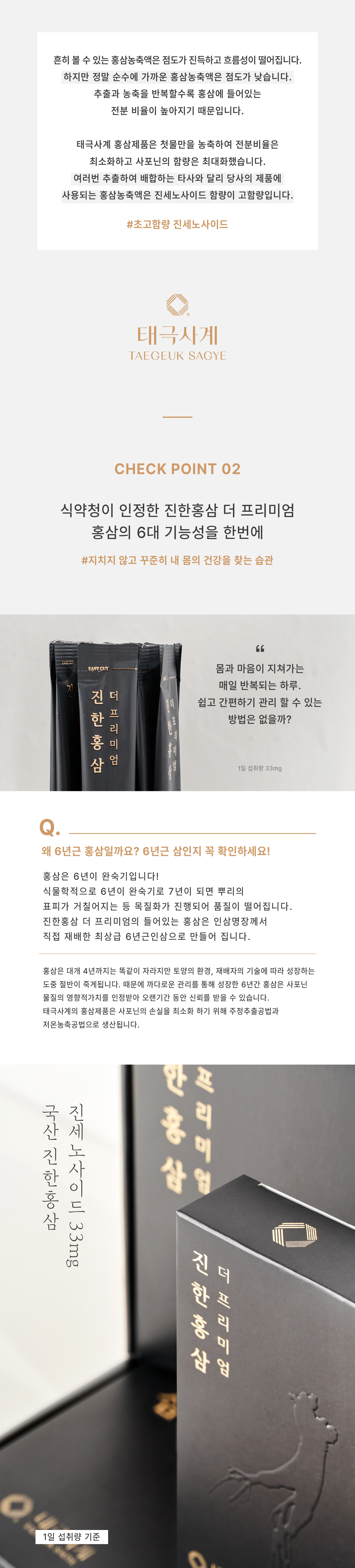 - 홍삼의 6대 기능성모두 인정받은 건강기능식품(혈앨순환 개선, 기억력 개선, 항산화, 면연력 증진, 피로회복, 갱년기 여성 건강에 도움)
